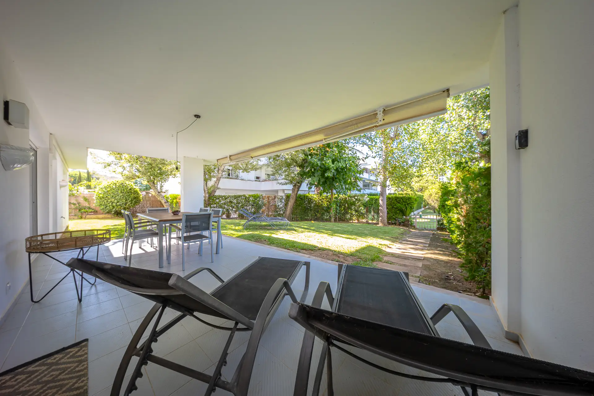 This lovely garden property is situated in one of the most sought-after areas in Bellresguard, known for its peaceful and upscale atmosphere! The spacious 130m² apartment with its private garden and proximity to the Pine Walk and beach is an amazing property with three good-sized bedrooms and two bathrooms, including an en suite. Furthermore the property offers a fully furnished and equipped kitchen and a spacious and bright living - dining room with direct access to the covered terrace of 25 m2 and the private garden of 126m², which is a fantastic feature, perfect for outdoor relaxation. The extensive community landscaped garden areas, sunbathing terraces, and swimming pool, adds great value to the property. Storage room and parking lot.